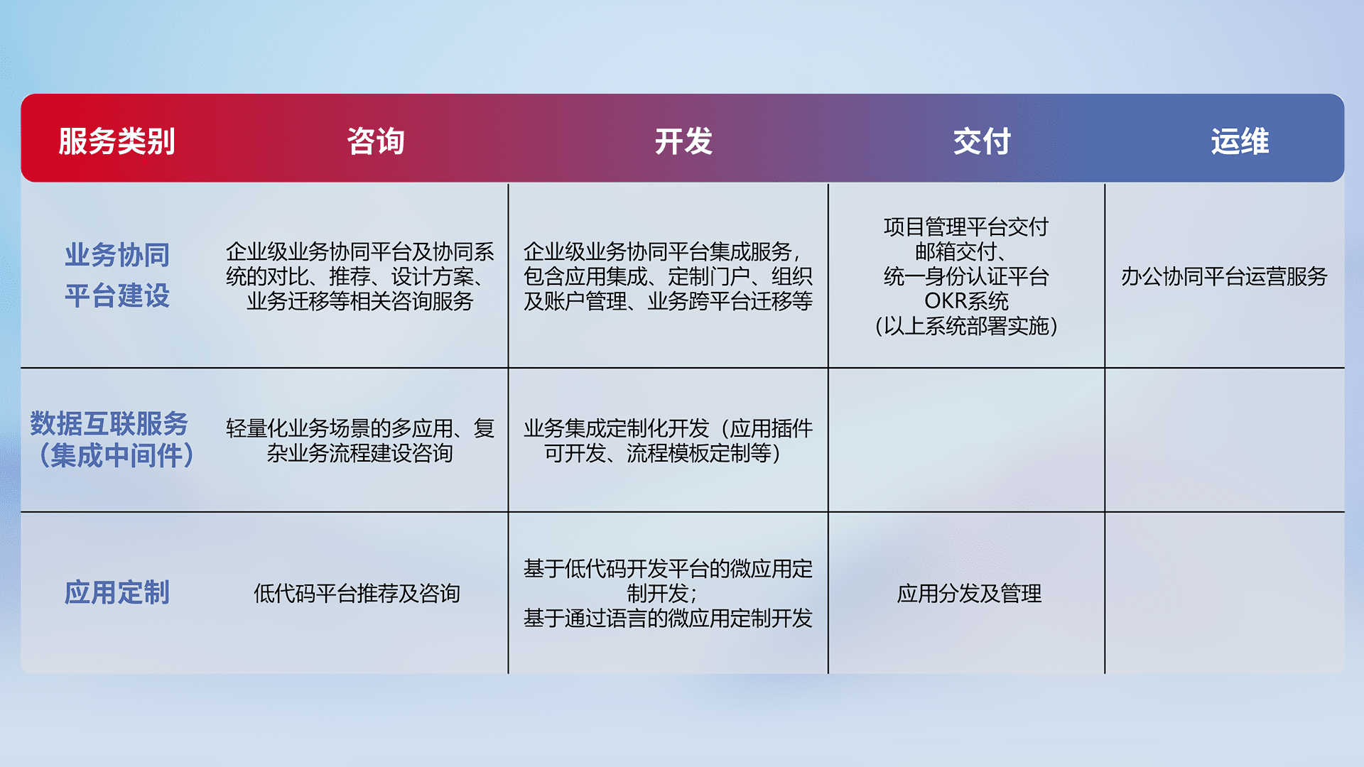 针对钉钉、、、企微、、、、IDaas等平台级产品提供产品的规划、、、、方案、、、交付、、、定制化开发等服务,,,,实现如统一协同办公、、、、智能客户服务、、、混合会议管理、、、、智能数据查询、、、等业务场景,,,,实现数字化转型。。。。