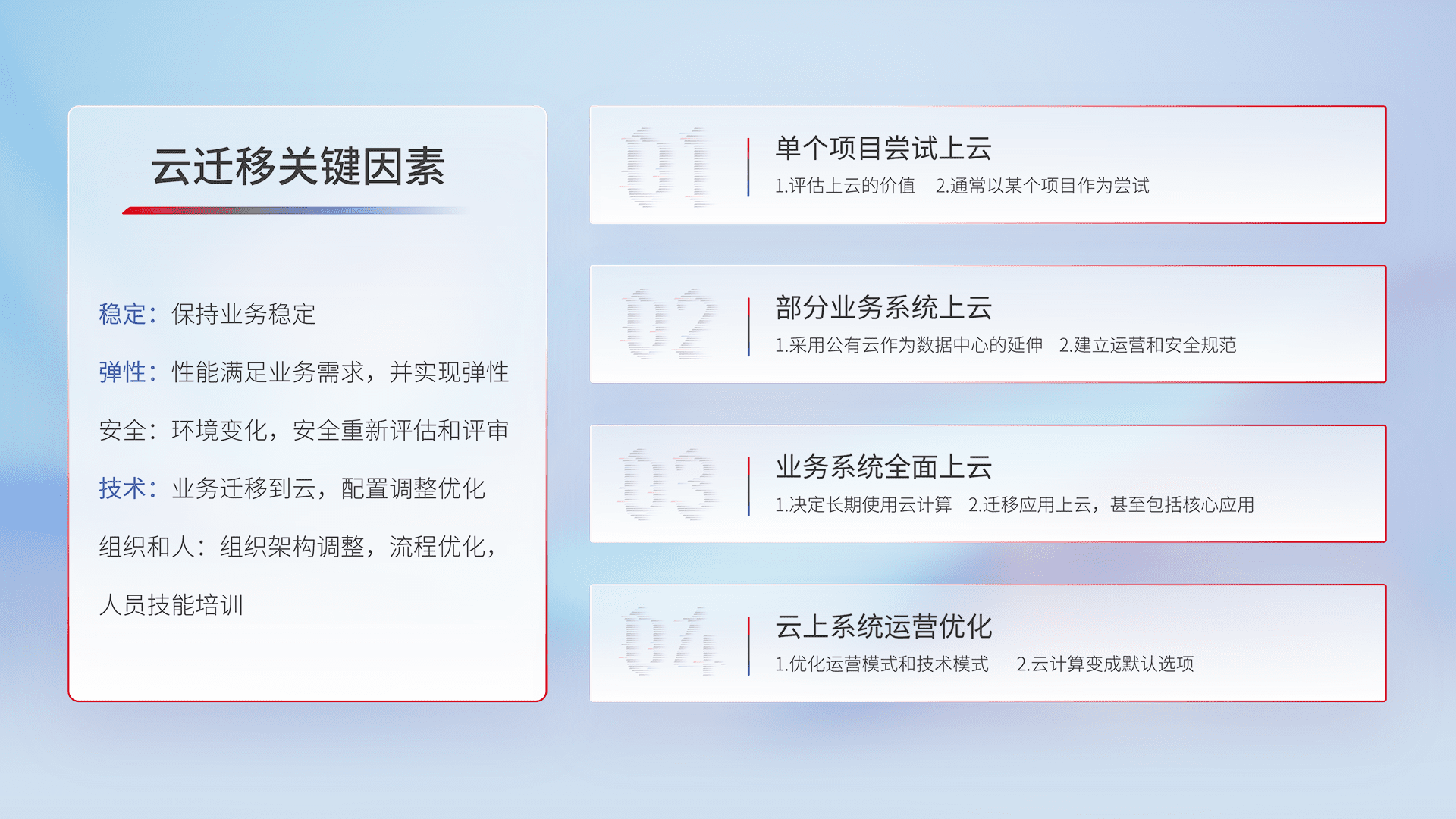 结合实际业务,,,从规划设计、、、云平台选型、、云原生改造、、、数据迁移、、、集成交付,,,迁移全过程为客户识别最佳上云路径,,,,做好风险识别管理,,,设计网络架构、、身份权限、、安全审计合规、、、、操作审计、、日志审计、、、监控告警策略、、、、多站点容灾设计等,,,,对云上基础设施进行整体规划,,,,提升IT治理水平,,,,以满足弹性、、、、高可用、、、、高性能的需求。。