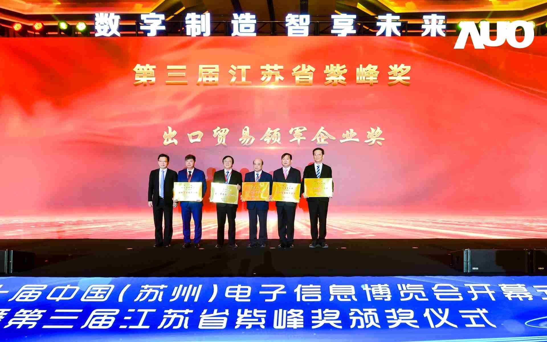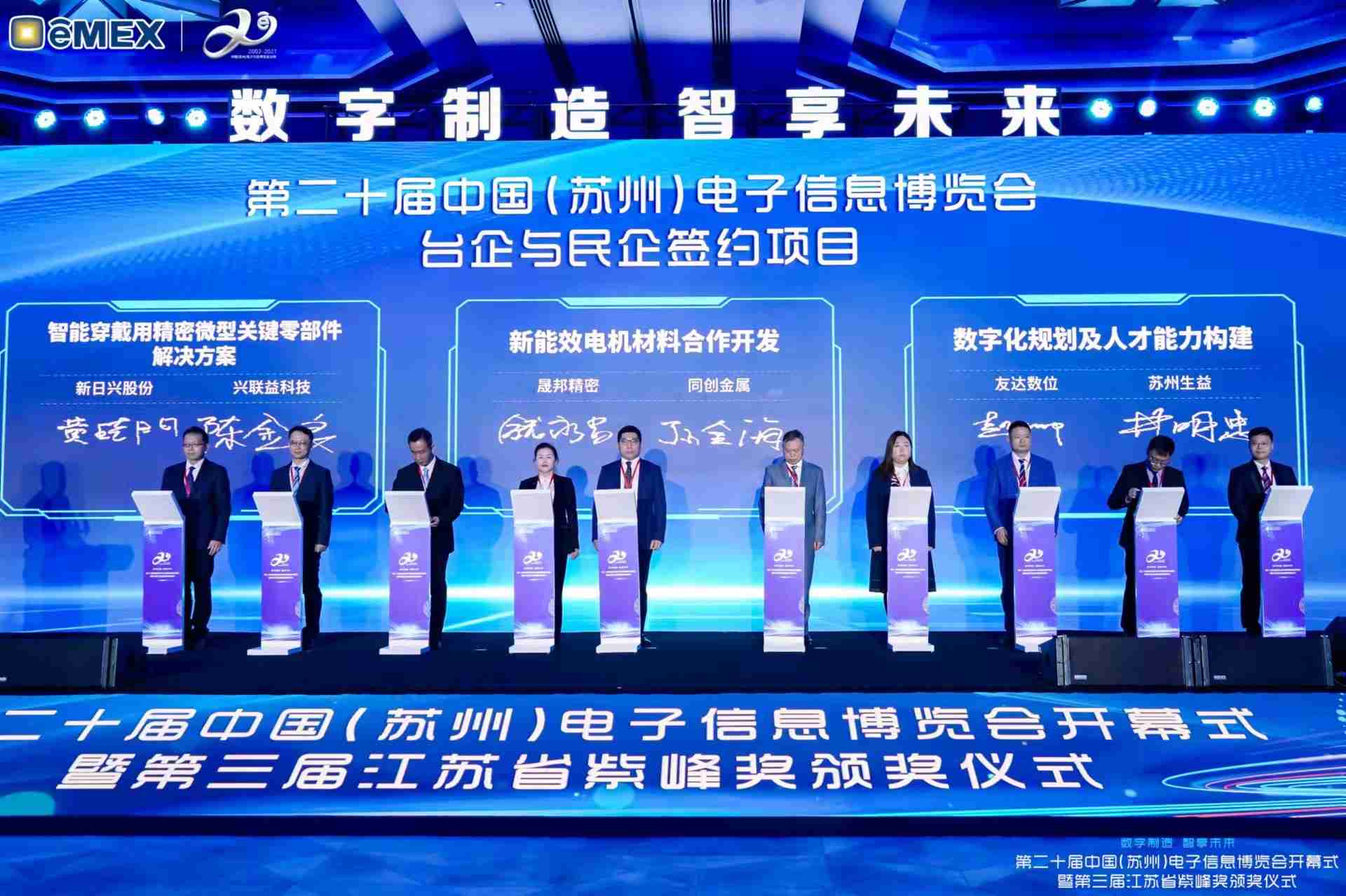 电博会开幕式当天也是第三届江苏省紫峰奖颁奖仪式,,省台办、、、工信厅、、商务厅、、苏州市相关领导均出席并颁奖。。。。该奖项为表彰对江苏高质量发展做出积极贡献的在苏企业,,由江苏省政府专门设立。。。。彩霸王光电 (苏州) 总经理郭振明代表上台领奖,,,这也是彩霸王苏州连续三次蝉联紫峰奖 出口贸易领军企业奖。。彩霸王数位总经理赵丽娜女士,,,也参与本次开幕式,,,上台为本地化赋能签署战略合作协议,,,将优质服务资源集合、、、、下沉到更多细分行业,,,为更多地区的制造企业提供数字化转型服务。。。
