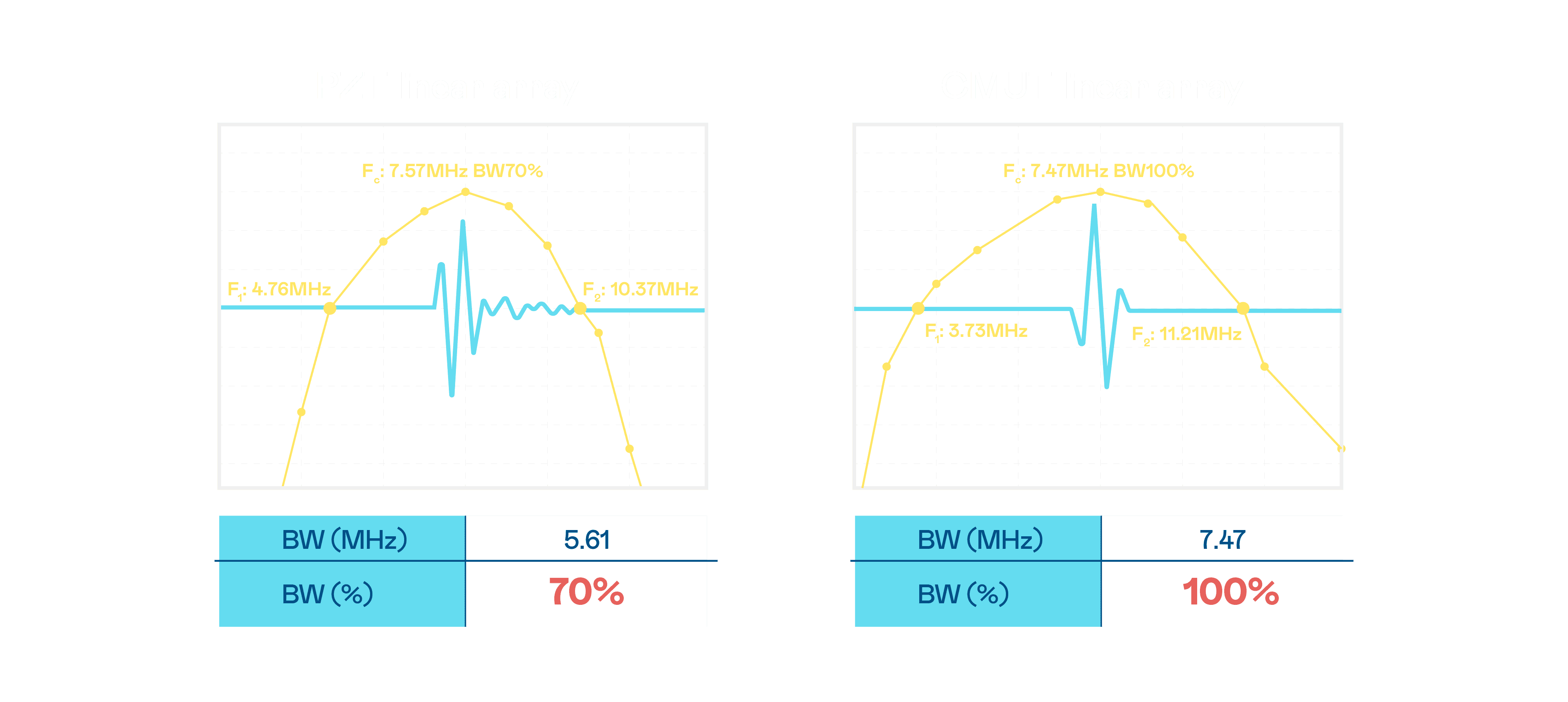 超音波影像的解析度高低,,首先取决于探头能发出的讯号频宽。。彩霸王 CMUT 可提供高清晰的超音波讯号,,,提供高频宽、、、、高灵敏度、、影像纹理细节更高的超音波影像,,协助医护人员缩短影像判读时间及利用精准的医疗影像进行诊断。。